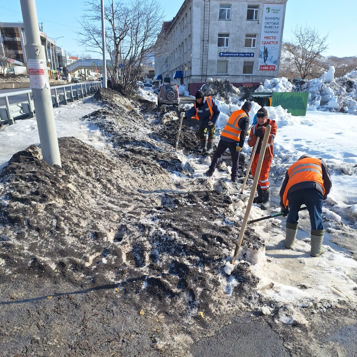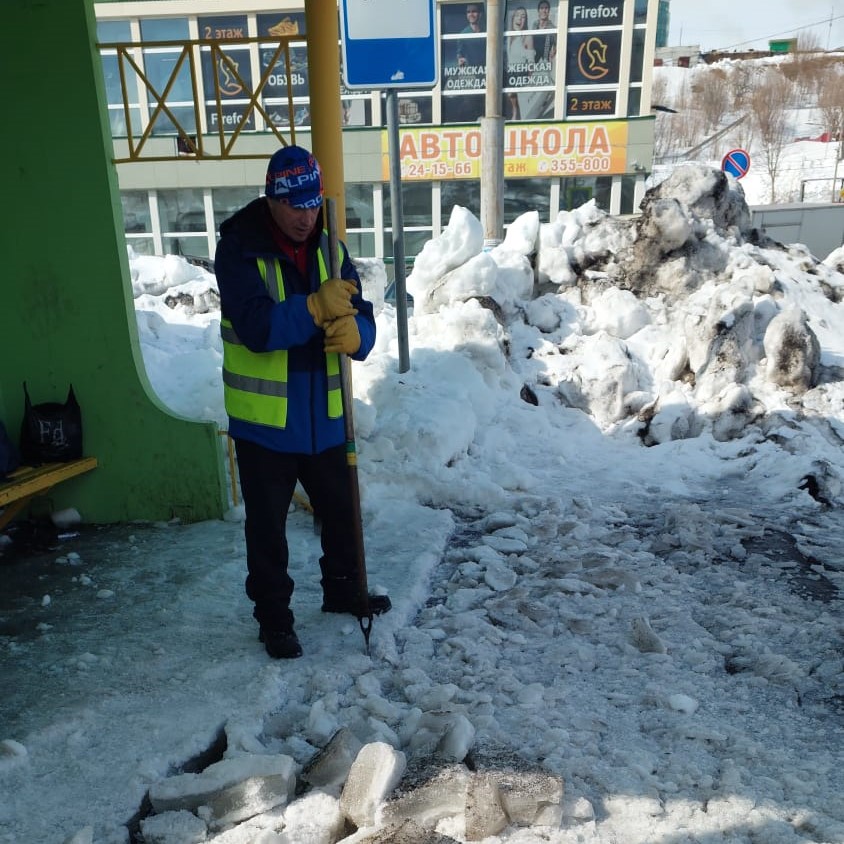 От наледи очищаются подходы к пешеходным переходам и автобусным остановкам.