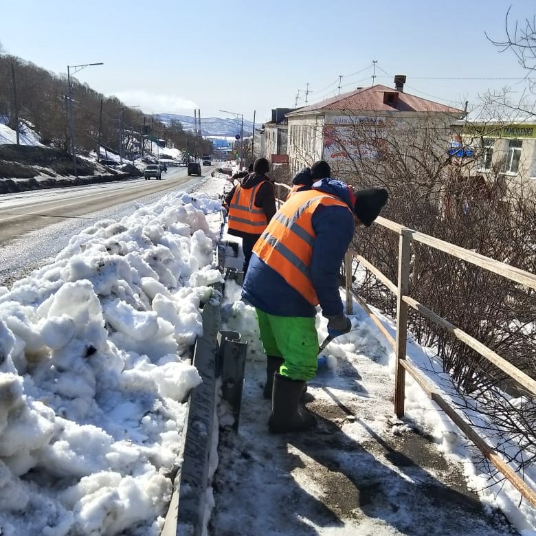 Бригады рабочих продолжают освобождать от снега тротуары вдоль «красной линии» и внутри кварталов.