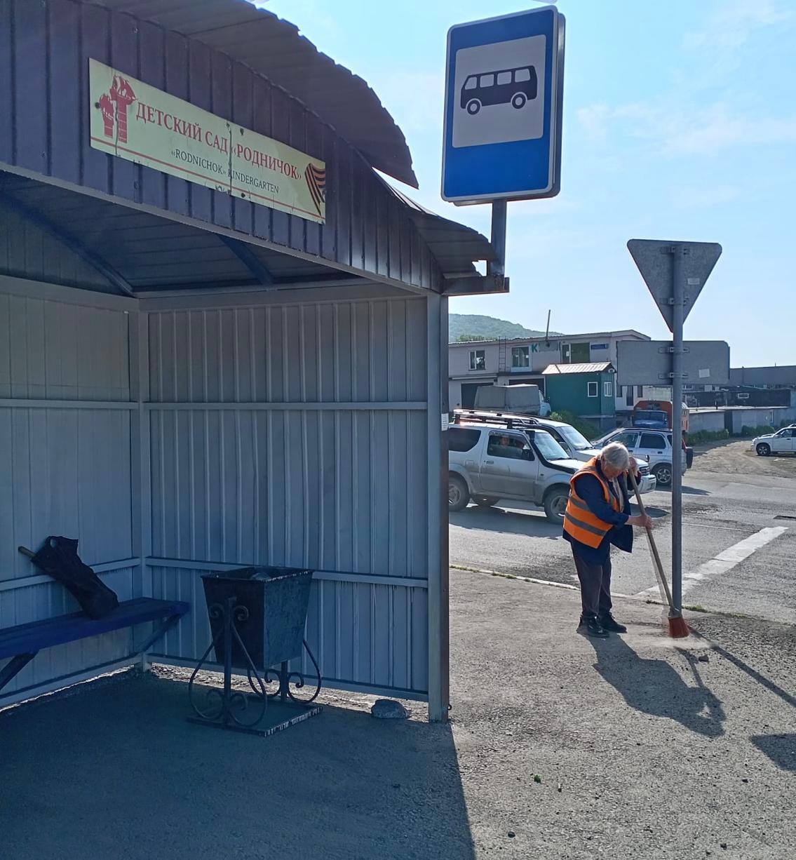 Осуществляется уборка остановочных павильонов и прилегающих к ним территорий.