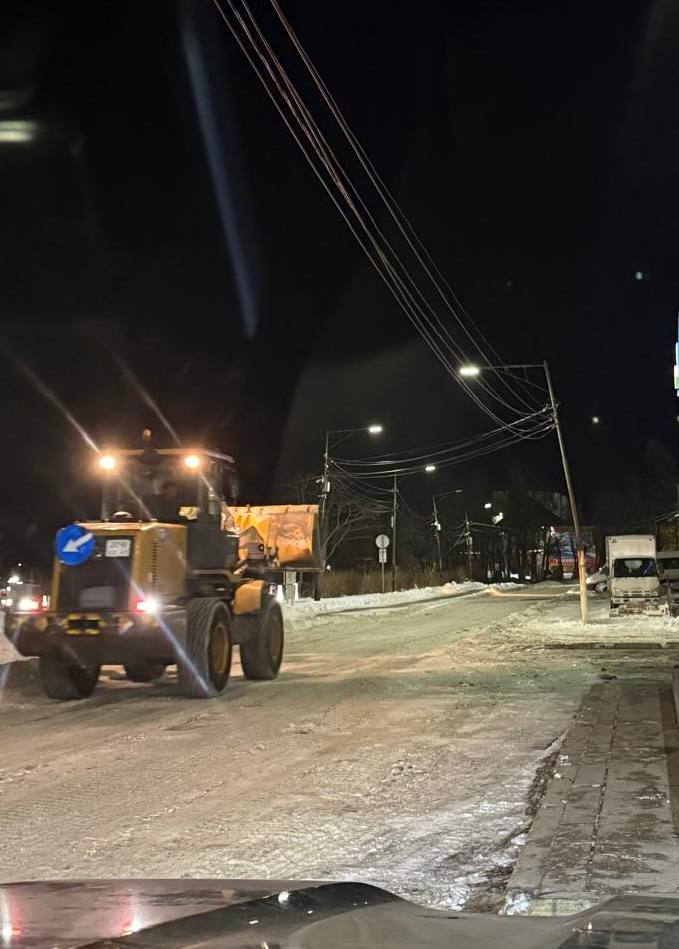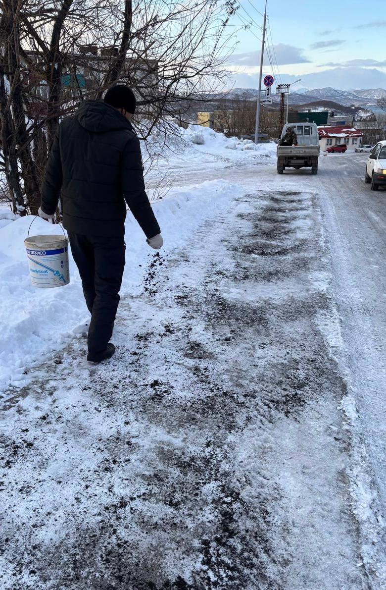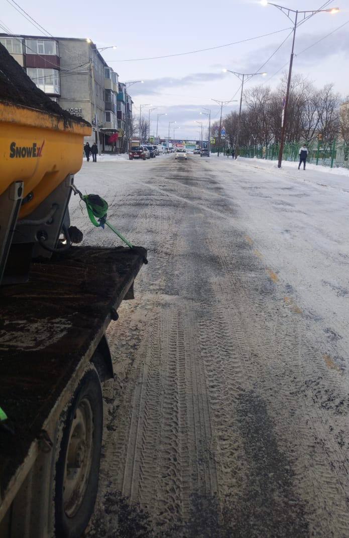 Техника работает на главных дорогах, внутриквартальных проездах, подъездах к объектам социальной сферы. Проводится обработка территорий противогололедными материалами.
