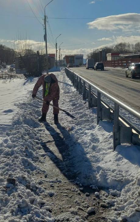 Бригады ручного труда очищают от снега и льда пешеходные переходы, тротуары и автобусные остановки.
