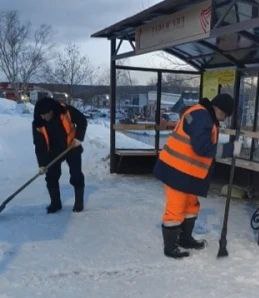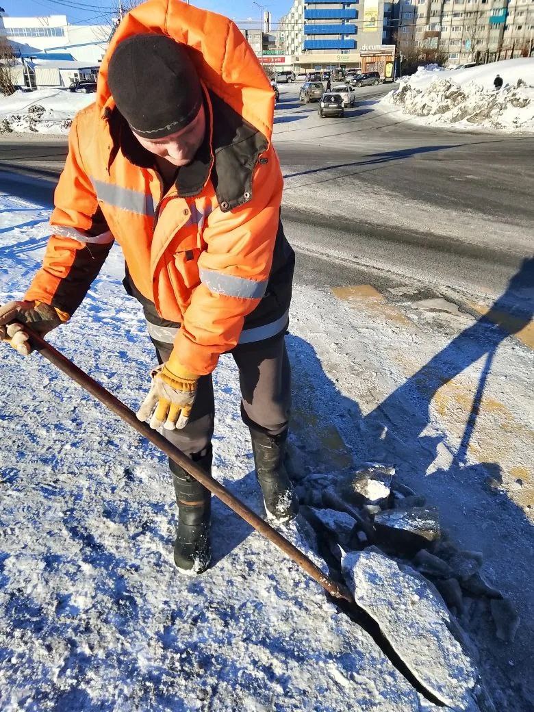Бригады ручного труда проводят очистку пешеходных переходов, тротуаров и автобусных остановок от наледи и снега, а также обработку противогололедными материалами.