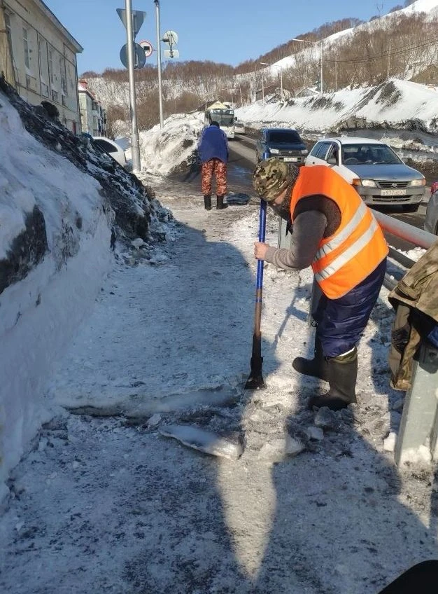 Бригады ручного труда расчищают от снега и наледи тротуары на улицах Океанской и Рябиковской, а также занимаются очисткой ливневых решёток от наледи на ул. Рябиковской.