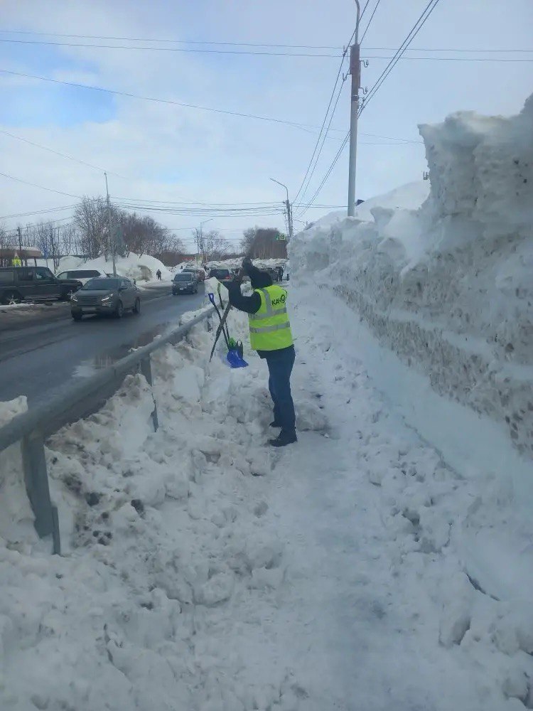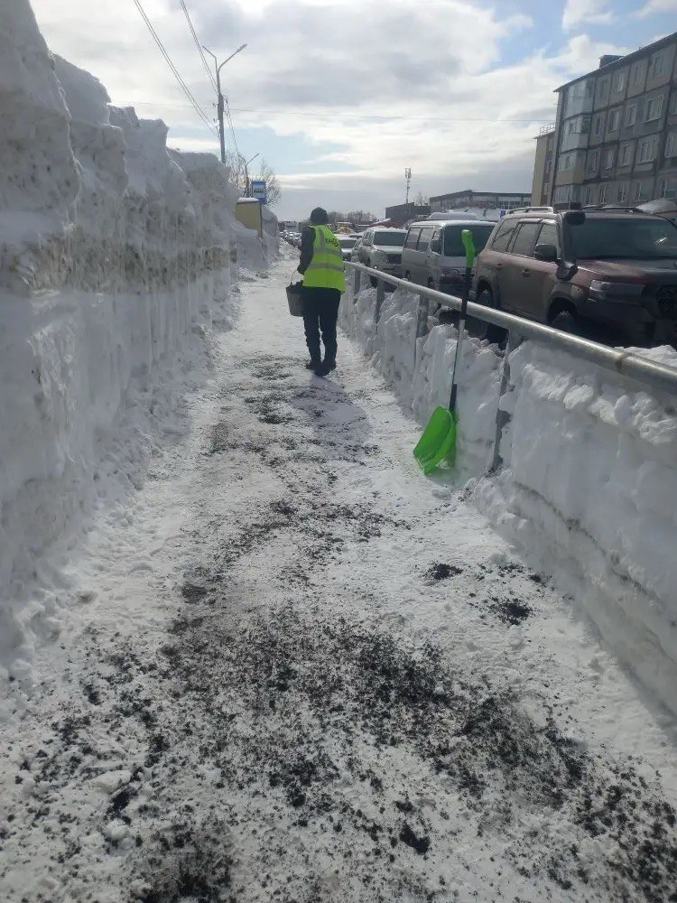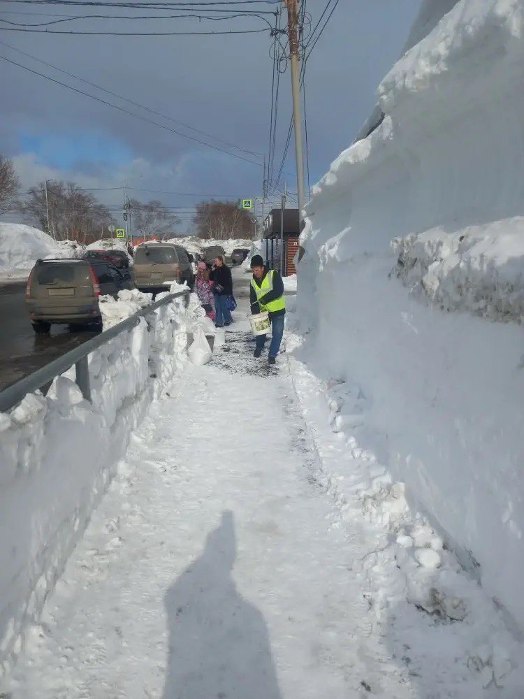 Бригады ручного труда расчищают тротуары и обрабатывают их песко-соляной смесью.