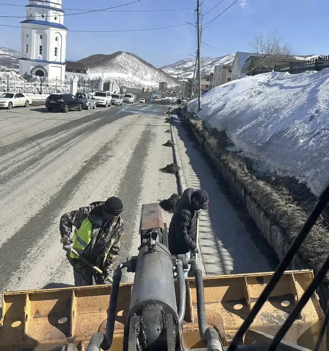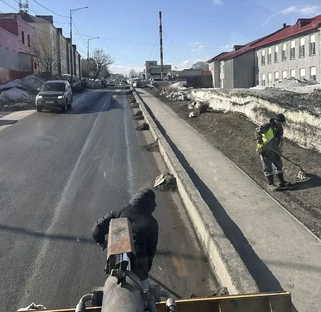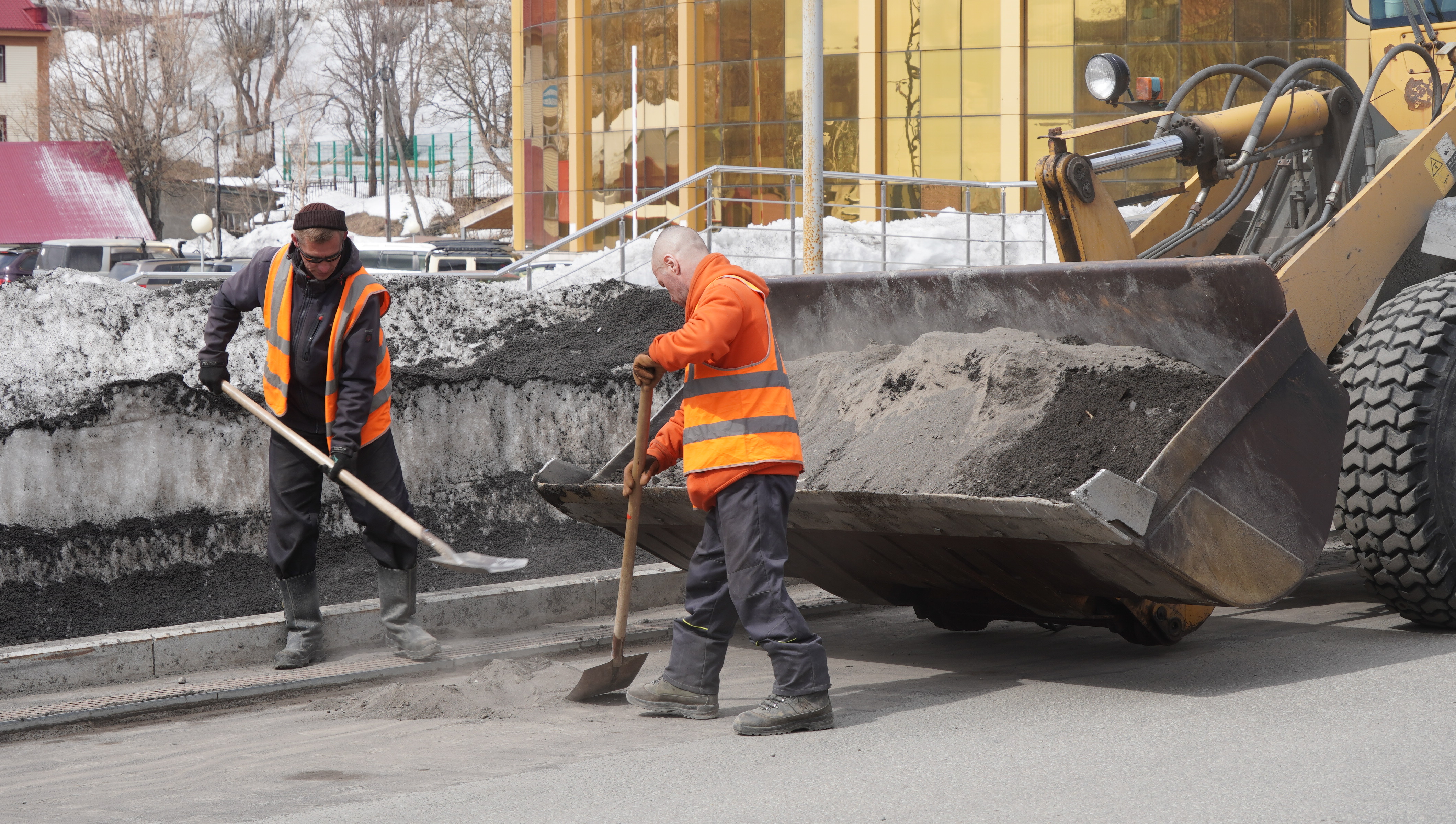 В течение дня бригады ручного труда убирали песок и мусор на пр. Победы (район 11 км) ул. Владивостокская.