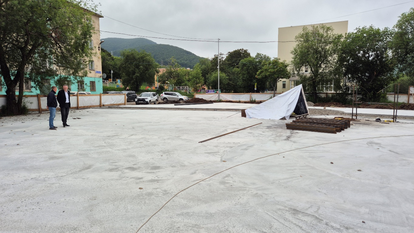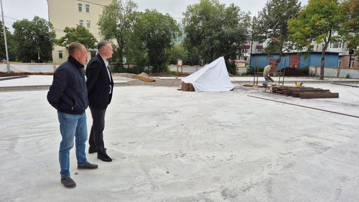 Исполняющий полномочия Главы города Владислав Масло проверил ход работ по благоустройству на ряде объектов, в том числе на будущей детско-спортивной площадке по ул. Пограничная, 18-20.