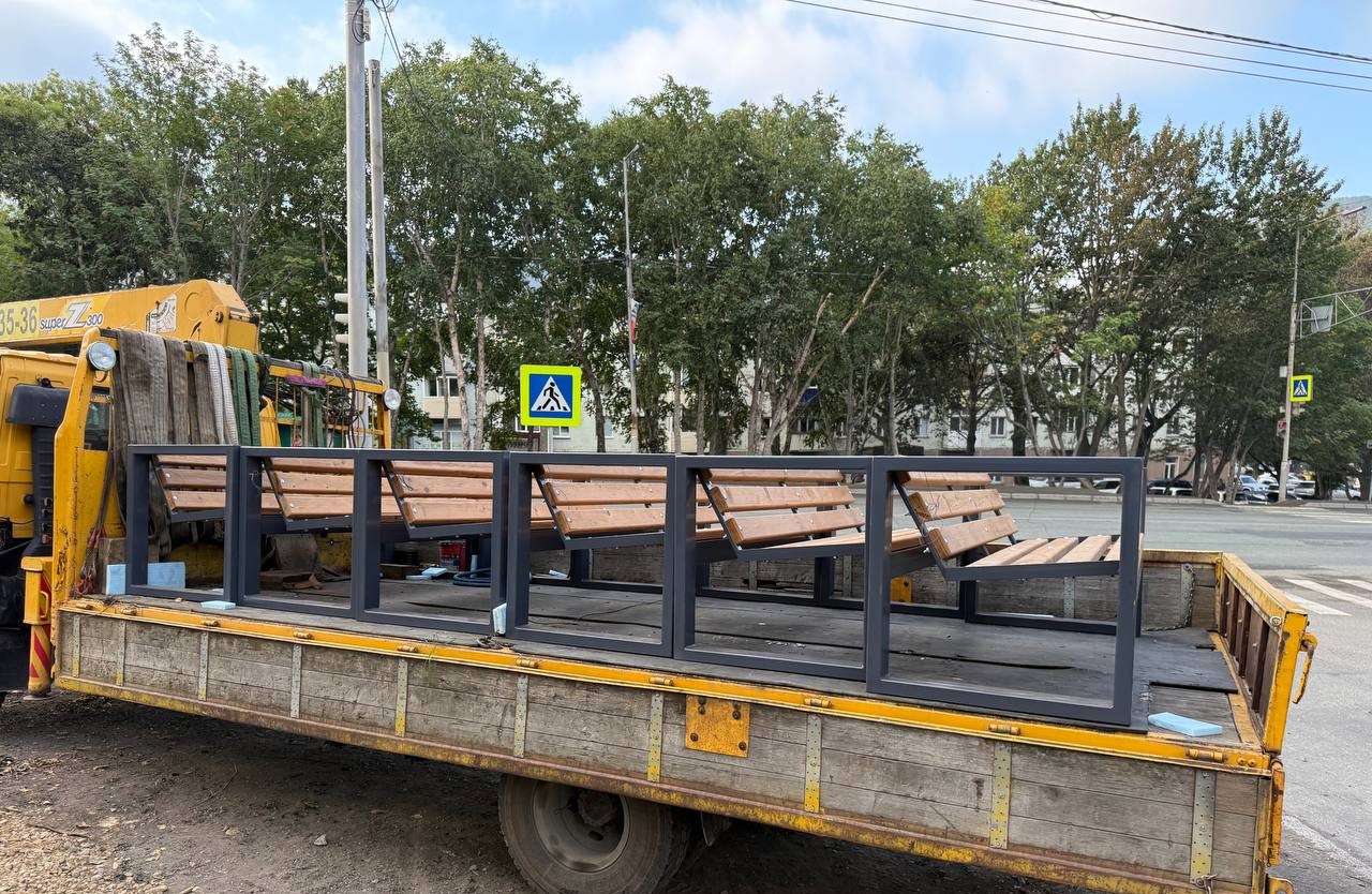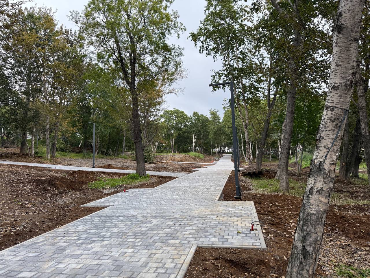 Уже выполнены работы по мощению дорожек, прокладке подземных линий электропередачи, установлены столбы освещения, ведется установка световых лавочек.