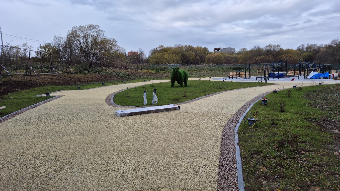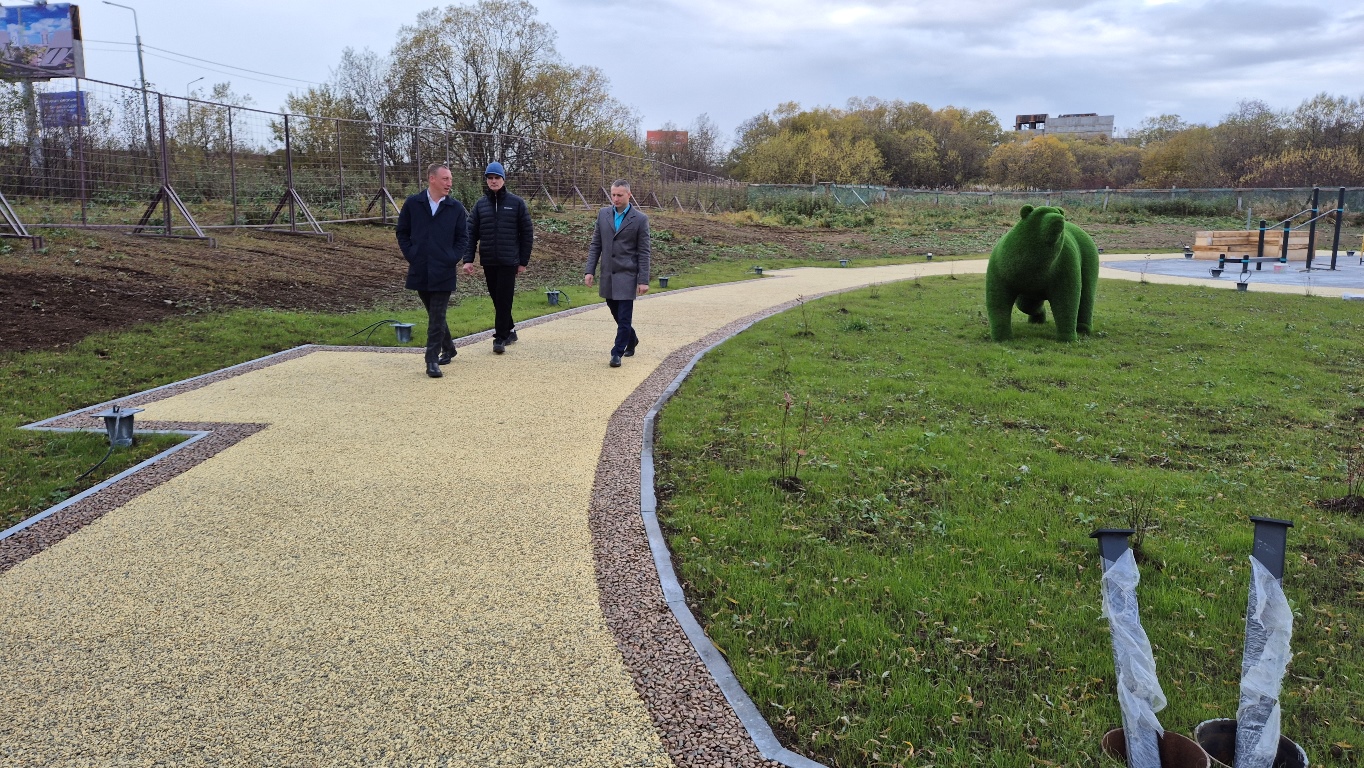 На территории установлены спортивные тренажеры, адаптированные для маломобильных групп населения, детский игровой комплекс, а также арт-объект в виде медведя, который призван порадовать юных горожан.