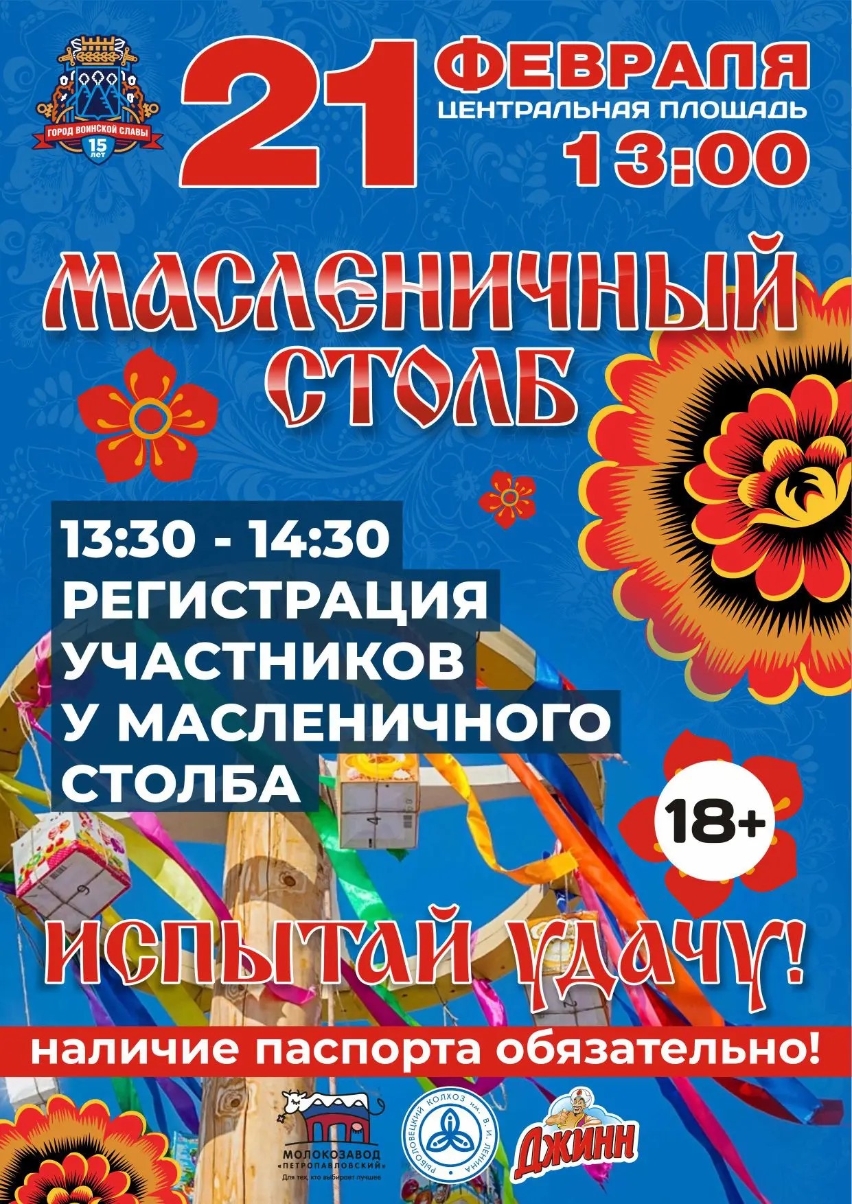 В 15:00 на территории площади у стелы «Город воинской славы» состоится насыщенная концертно-игровая программа «Масленичный разгуляй» с молодецкими забавами, хороводами, играми.