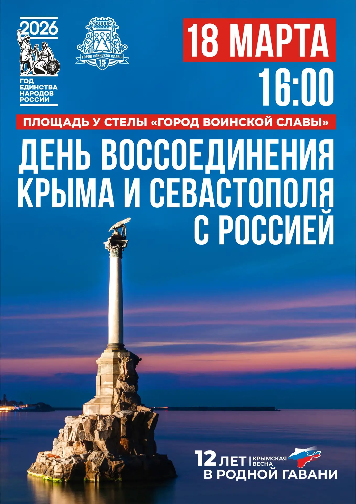 В 16:00 на площади возле стелы Города воинской славы лучшие солисты и творческие коллективы города представят концертную программу «12 лет вместе: Россия – Крым!». Со сцены прозвучат патриотические песни.