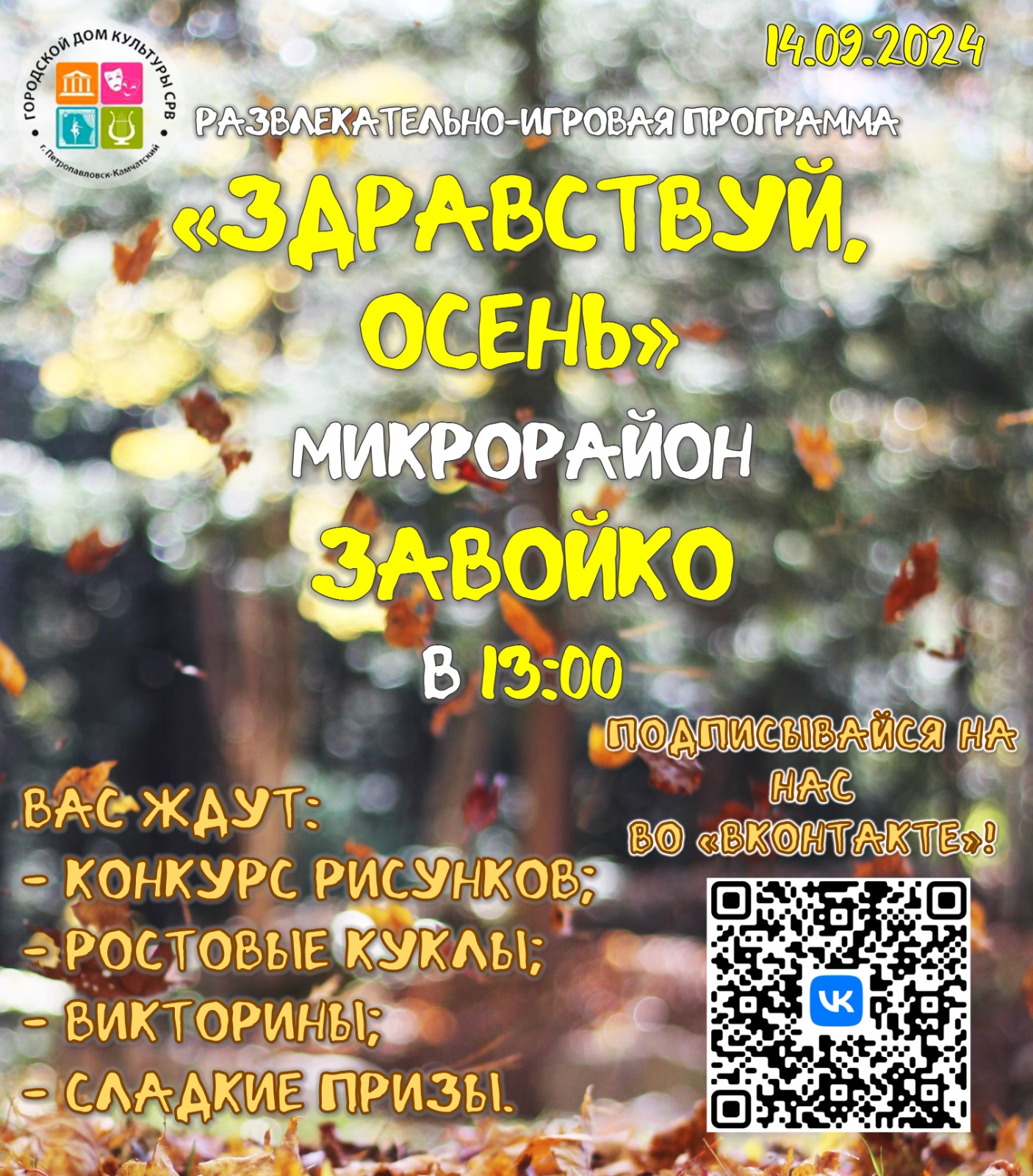 В субботу и воскресенье с 13 до 15 часов для горожан пройдет развлекательно-игровая программа «Здравствуй, осень!». 14 сентября мероприятие состоится на территории детской площадки по улице Петра Ильичева, 54, 58 в микрорайоне Завойко. 15 сентября — в парке на улице Индустриальная.