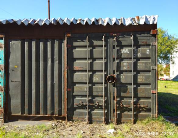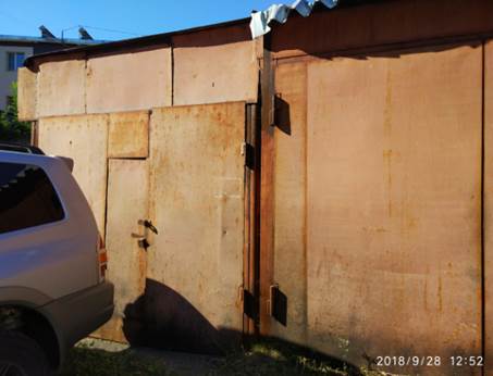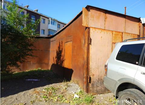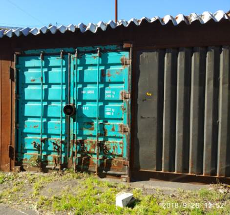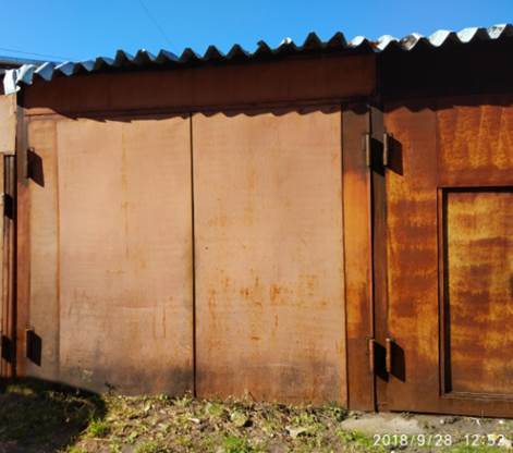 снимок № 5 – объект, не являющийся объектом капитального строительства, коричневого цвета, покрасочный слой местами поврежден, крыша плоская, шифер серого цвета, без регистрационного номера, свободный доступ внутрь объекта отсутствует, имеются следы ржавчины, навесные замки и антивандальные механизмы отсутствуют;