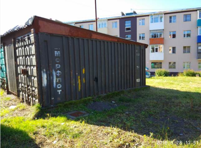 снимки №№ 1-2 – объект, не являющийся объектом капитального строительства (контейнер для перевозки и хранения грузов), черного цвета, покрасочный слой местами поврежден, крыша плоская, шифер серого цвета, имеются следы ржавчины, имеется один навесной замок и один антивандальный механизм, свободный доступ внутрь объекта отсутствует, с одной из боковых сторон имеется надпись «Морфлот»;