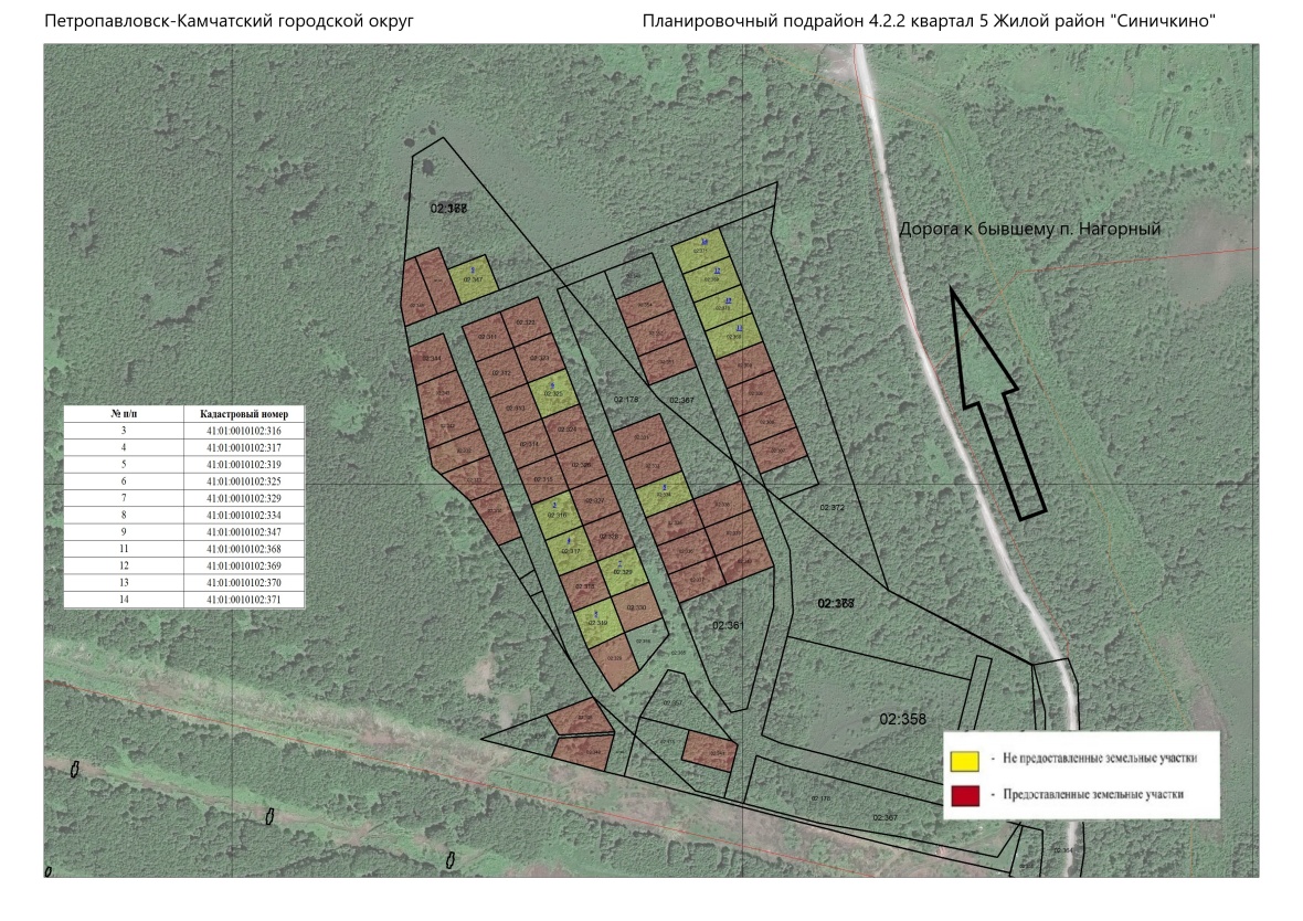 | 14 | 41:01:0010102:371 | Российская Федерация, Камчатский край, Петропавловск-Камчатский городской округ, г Петропавловск-Камчатский | 1500 | для индивидуального жилищного строительства |