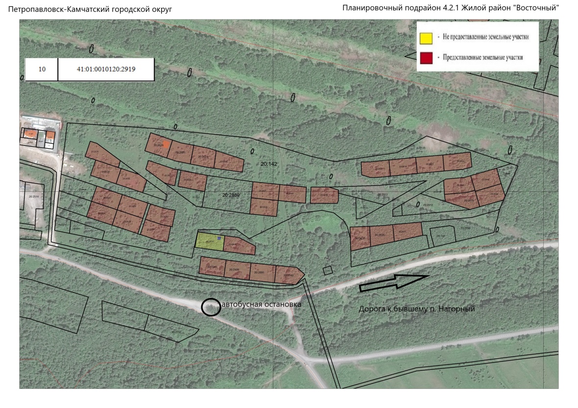 | 10 | 41:01:0010120:2919 | Российская Федерация, Камчатский край, г. Петропавловск-Камчатский, ш. Восточное | 1500 | для индивидуального жилищного строительства |