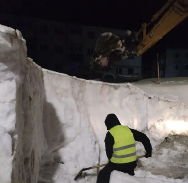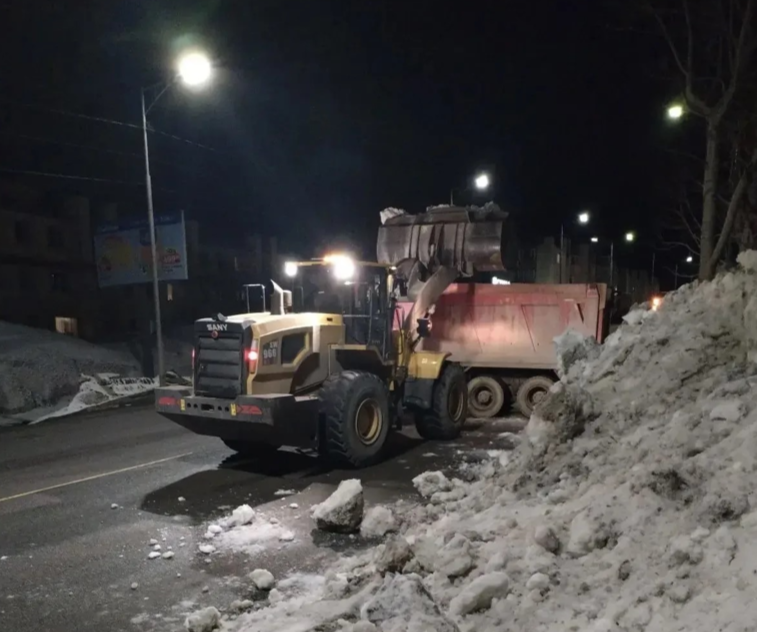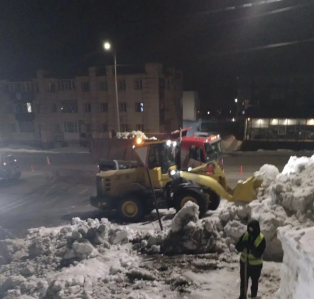 В ночную смену проводились работы по вывозу снежных масс и очистке тротуаров на пр. 50 лет Октября.