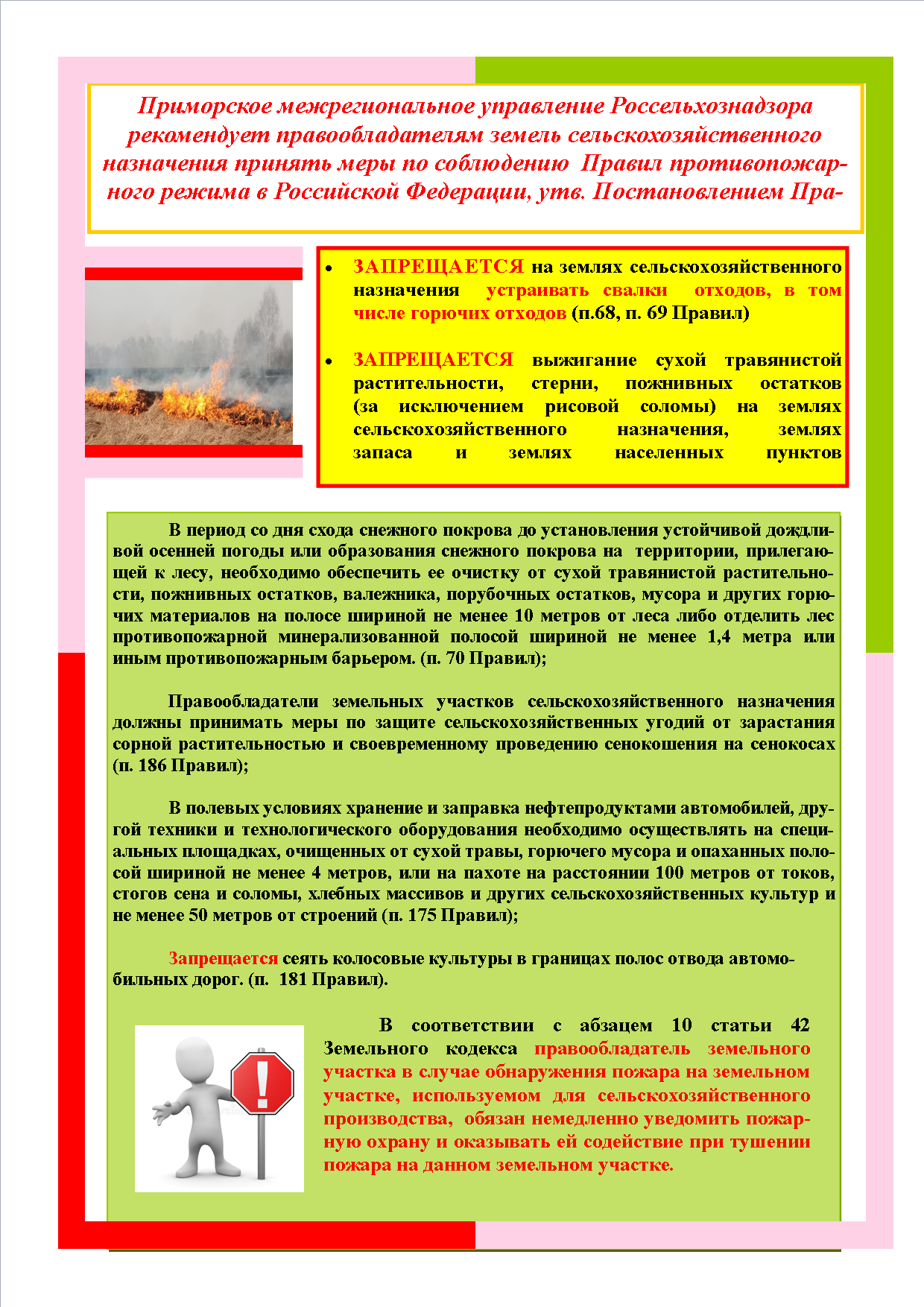 Статьей 42. Земельного кодекса Российской Федерации установлены обязанности собственников земельных участков и лиц, не являющихся собственниками по осуществлению мероприятий по охране земель, по соблюдению противопожарных правил, в том числе мер пожарной безопасности, так в случае обнаружения пожара на земельном участке, используемом для сельскохозяйственного производства, немедленно уведомить пожарную охрану и оказывать ей содействие при тушении пожара на данном земельном участке.