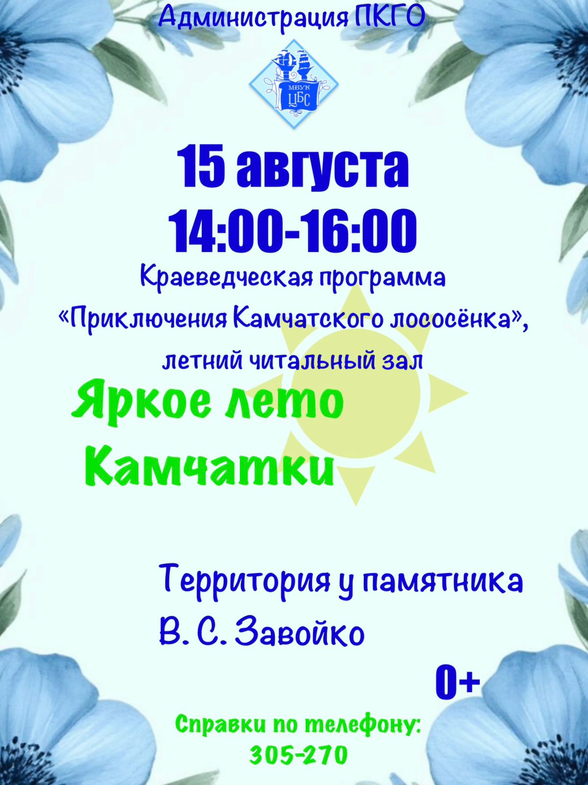 14:00 – краеведческая программа «Приключения камчатского лососёнка» на территории памятника В.С. Завойко;