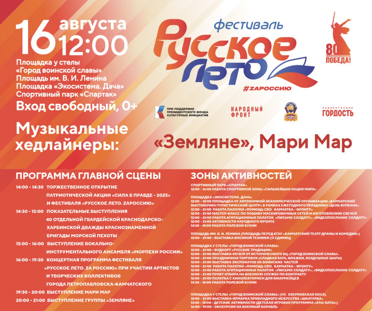 Напомним, что в Петропавловске-Камчатском 16-17 августа состоится три масштабных мероприятия: мультижанровый творческий фестиваль «Русское лето. ZaРоссию», агитационно-пропагандистская акция «Сила в Правде – 2025», а также День физкультурника.