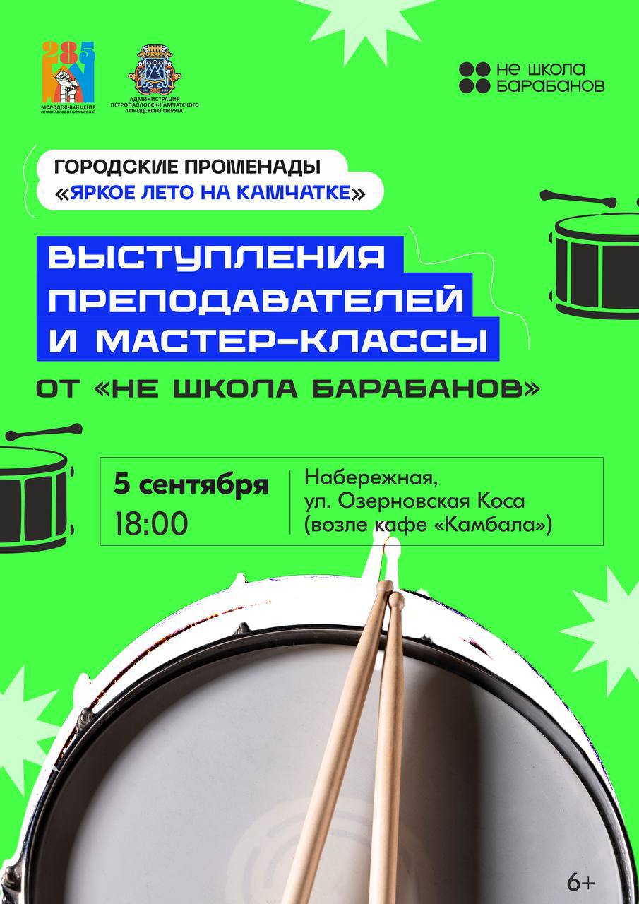 · 18:00 – выступления и мастер-класс от «Не школы барабанов» на набережной по ул. Озерновская коса.