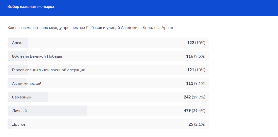 В ходе голосования горожане также предлагали собственные варианты наименований, среди которых были «Парк им. Академика Королева», «Зеленая роща», «Рыбаков» и многое другое.